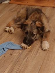 Der kleine Rüde ist alterstypisch lebhaft und verspielt und muss natürlich noch viel lernen für das Leben als Familienhund.