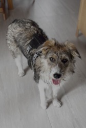 Allerdings bin ich leider - auf der Suche nach Futter auf den Straßen Rumäniens - von einem Auto angefahren und liegen gelassen worden. Schwer verletzt habe ich mich zu meinen Welpen geschleppt und wurde so im Dezember '23 im Straßengraben gefunden. Meine Kinder durften alle ausreisen, ich blieb alleine zurück: ich kann seit dem Unfall nicht mehr laufen und meine Ausscheidungen nicht mehr kontrollieren - wer will schon einen Hund wie mich???